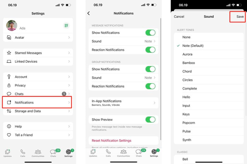 - Untuk notifikasi pesan, ketuk "Nada Notifikasi" dan pilih nada yang diinginkan.